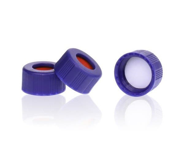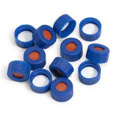 Preassembled cap and septa for 9mm thread screw, PP cap, blue, centre hole, White-PTFE/red Rubber, 0040″ thick